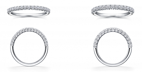 URISはクラシカルなデザインにプラチナの硬度を活かしたサイドデザインが特徴で、0.25カラットのダイヤモンドを配します。一方、ALVINは気品ある佇まいと輝きを持つクラシカルなデザインで、0.45カラットのダイヤモンドを使用しています。いずれもハーフエタニティリングであり、婚約指輪や結婚指輪との重ね着けに加え、日常にも華やぎを添えることを意図しています。