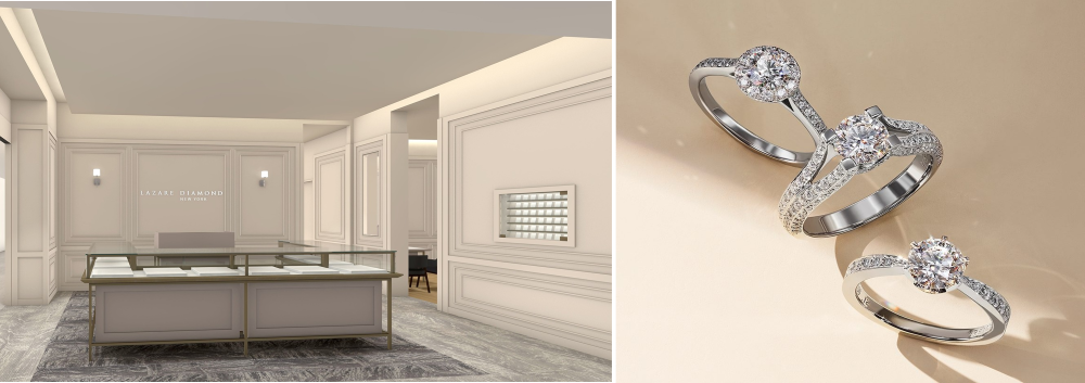 「ラザール ダイヤモンド ブティック」は、ニューヨーク発のダイヤモンドカッティングブランドである「ラザール ダイヤモンド」を取り扱う専門店として、日本国内の大都市を中心に15店舗を展開しています。新店舗では、「ラザール ダイヤモンド」が誇る「伝統」「品質」「信頼」に、現代的な感性や時代のトレンドを融合させた新デザインを採用。フロア全体を使ったゆとりある上質な空間で、”The World’s Most Beautiful Diamond®(世界で最も美しいダイヤモンド)“をご覧いただけるほか、気軽に商品をご覧になりたいお客様のニーズにもお応えいたします。